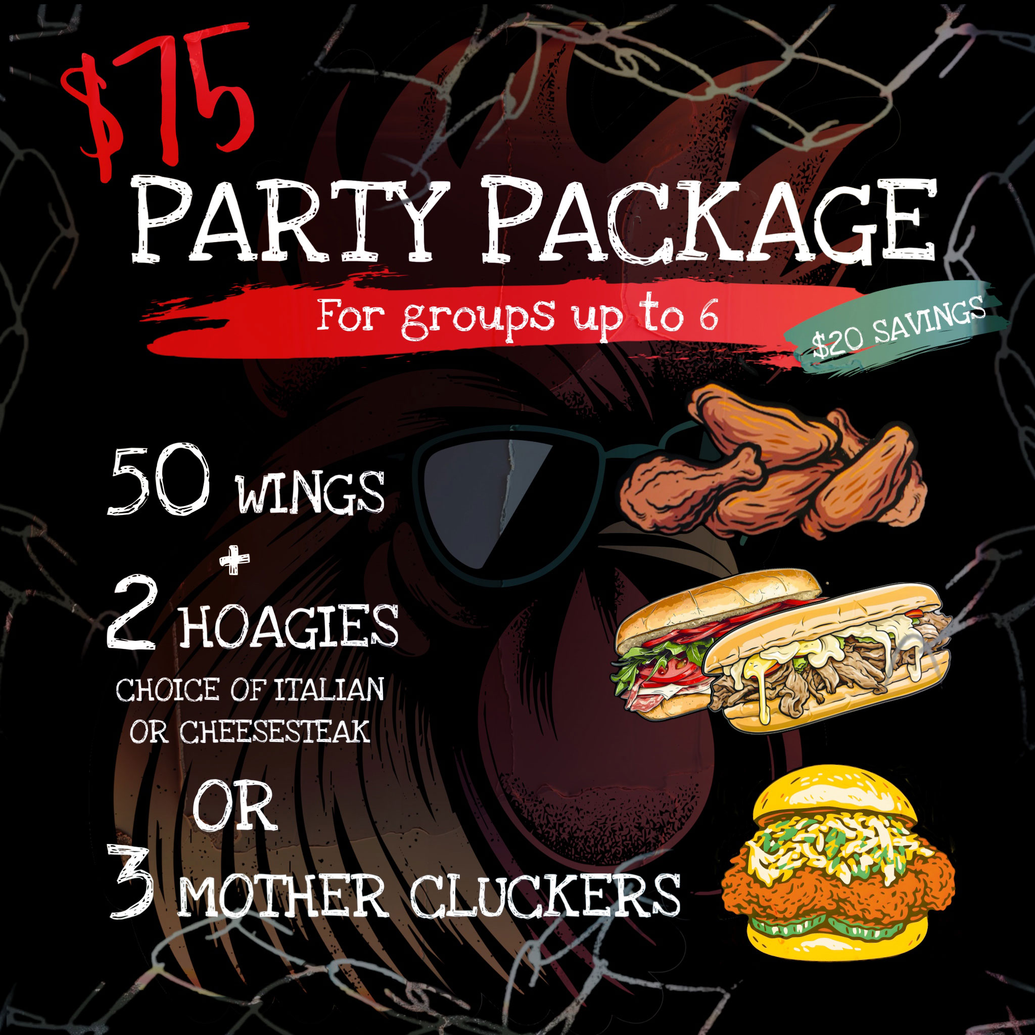 (125) Wings. Choose up to 4 wing flavors. (15) Hoagies cut in 1/2. Choice of Italian or Cheesesteak OR (16) Mother Cluckers. No substitutes. (125) Wings $80 Savings Suggested for groups up to 30 people Pre-orders for party packages are encouraged to avoid long wait times!